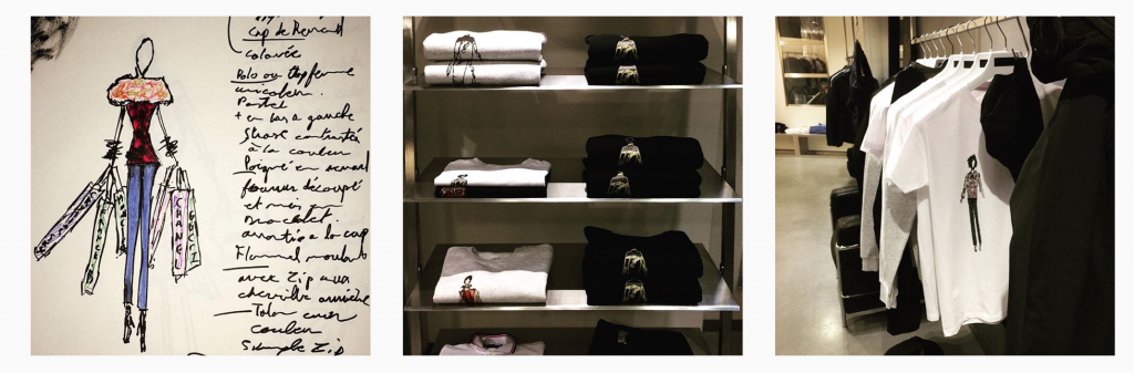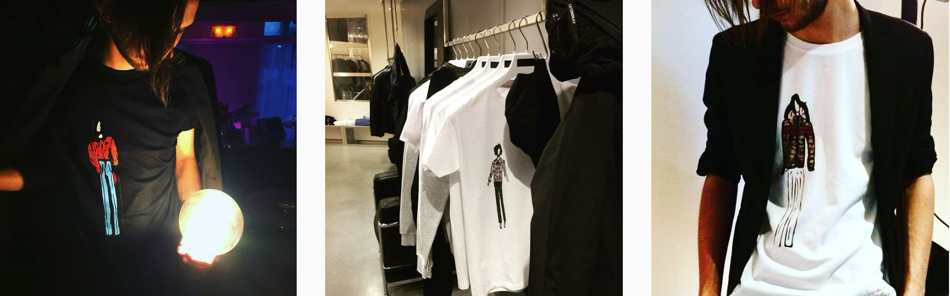 Le tee shirt devient dans l’esprit du designer sa feuille sur laquelle née de la pointe de son crayon et de ses innombrables mouvements une robe, une chemise, un pantalon, une jupe, un personnage, des photos ou un mannequin…